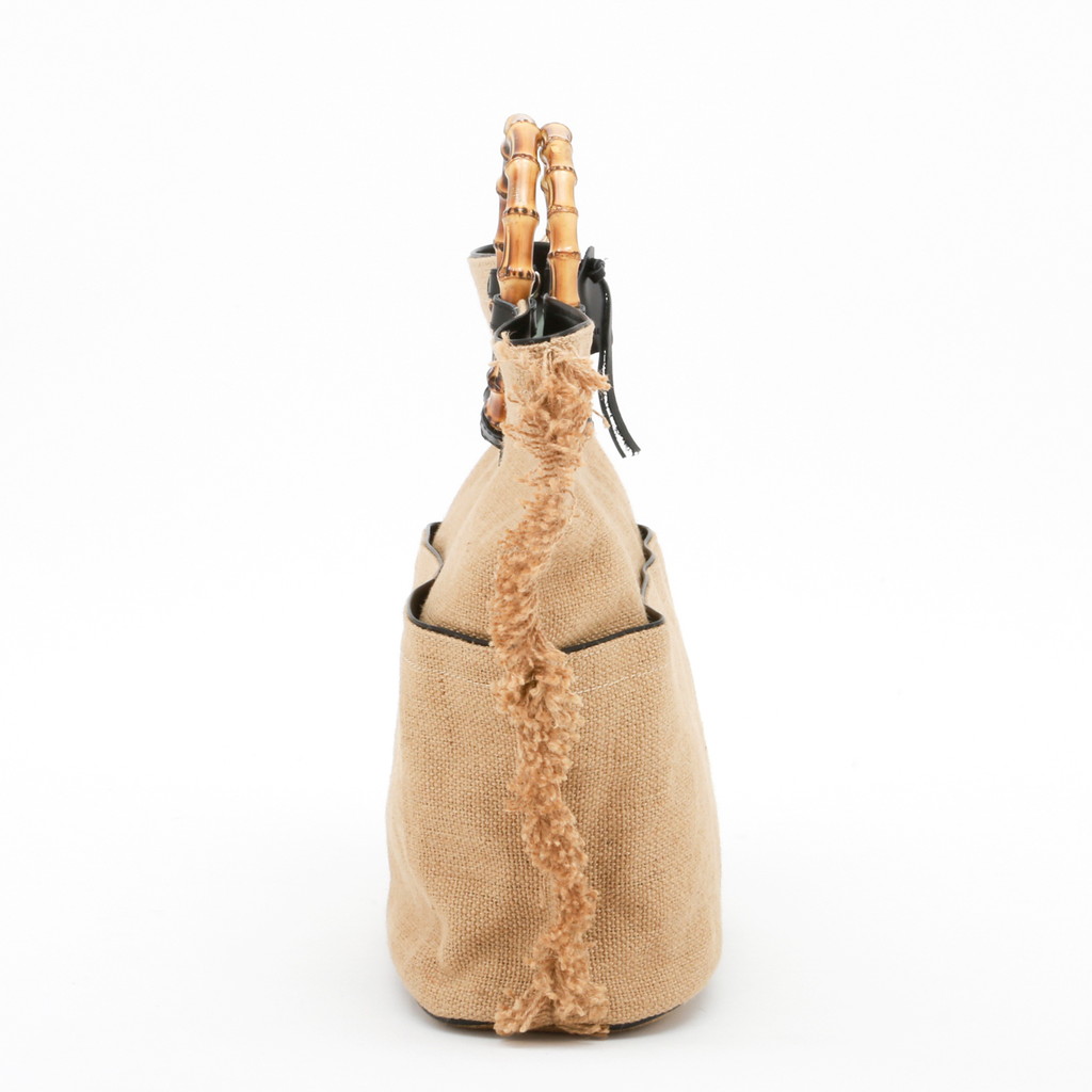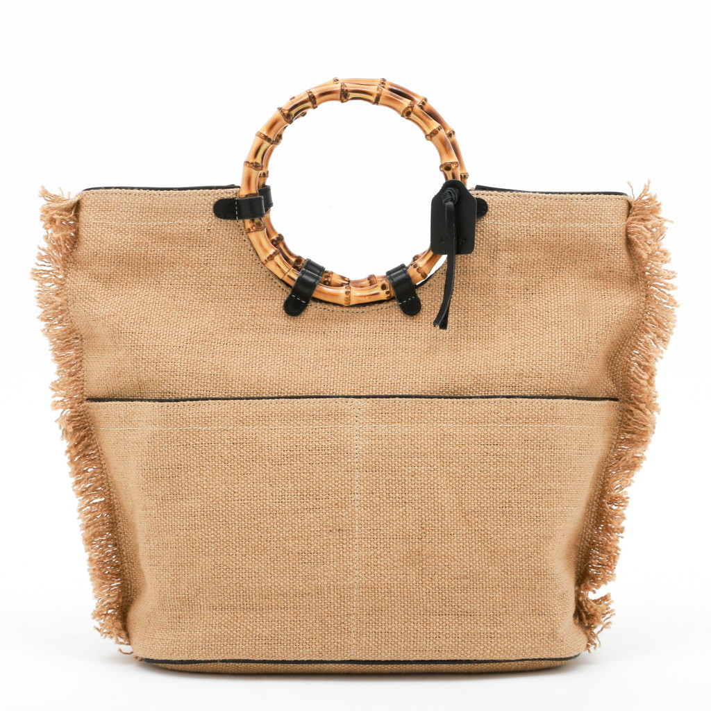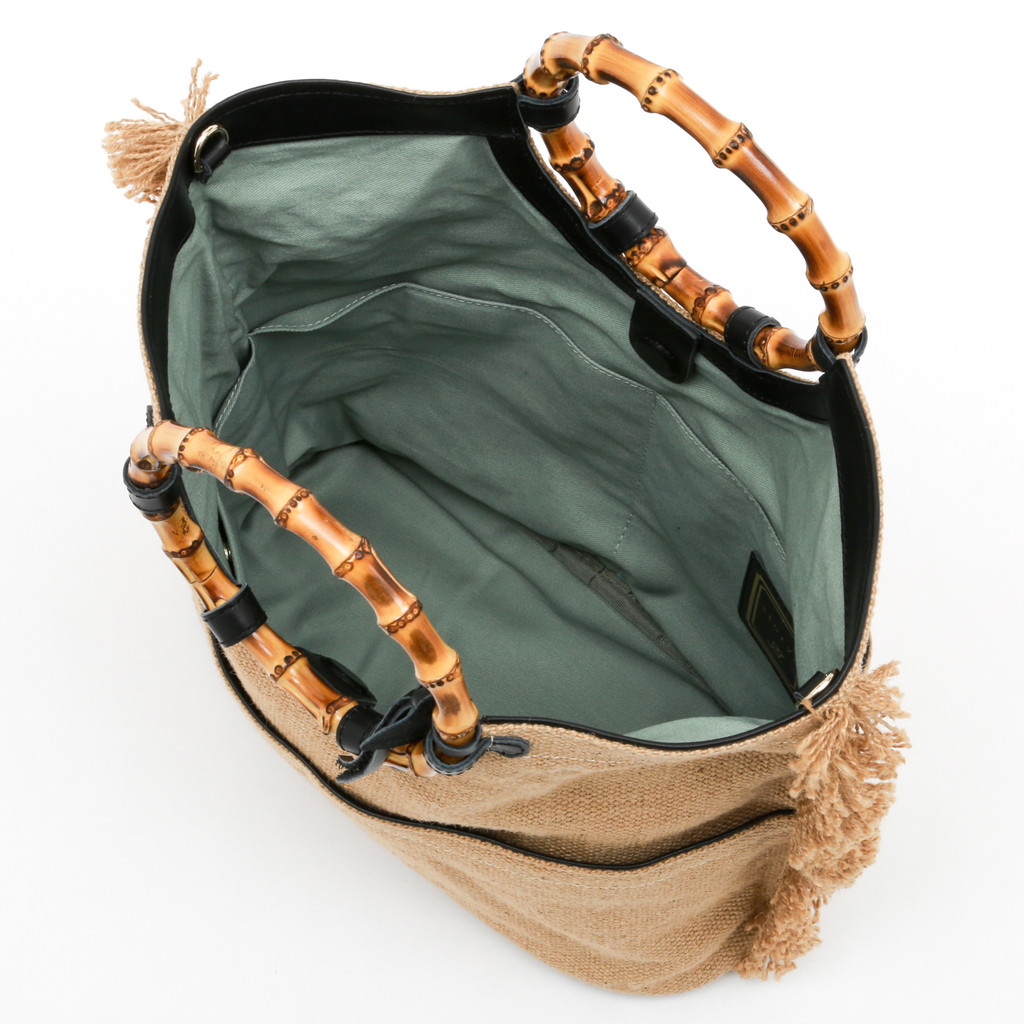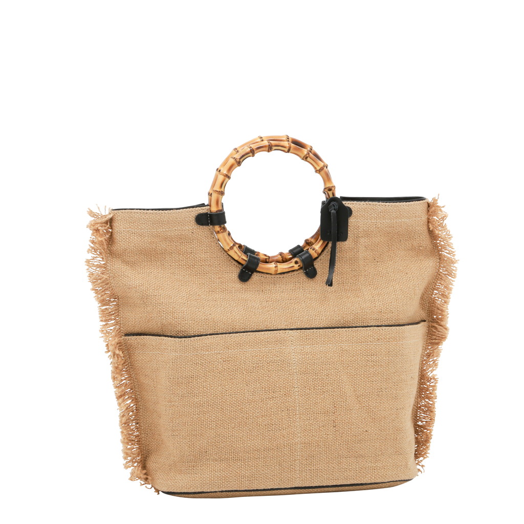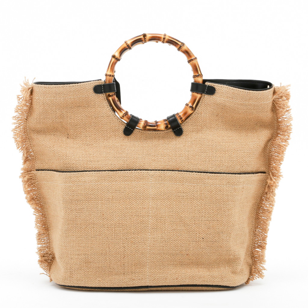 円形のバンブーハンドルが特徴的な大きめのトート。リリネン×革のコンビや抜け感のあるカットオフなど、シンプルながらもリゾートライクな雰囲気がただよいます。ポケットも多く、容量が大きくたっぷり入るサイズはデイリーに持てる使い易さが魅力。取外し可能なストラップで肩に掛けてお使いいただけます。