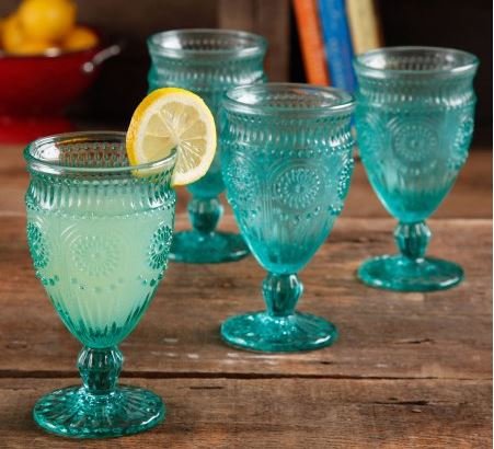 The Pioneer Woman Adeline Embossed 12-Ounce Footed Glass Goblets, Set of 4, Turquoise