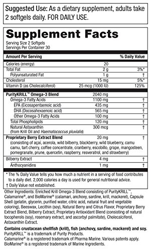 The rising star of the Omega-3 world, Krill Oil has been heralded for its unique phospholipid complex and the powerful Astaxanthin it provides. Phospholipids carry the EPA & DHA directly into the cells, allowing the human body to absorb them very easily. They are also important in protecting cell membranes from free radicals. Astaxanthin, one of nature's most powerful antioxidants, helps protect the body's tissues from oxidative stress, along with a wide range of other health-supporting benefits.* KrillBerry is virtually the same as Purity's best selling Krill Omega-3 Super Formula. KrillBerry features an additional 20mg super fruit and berry proprietary blend.