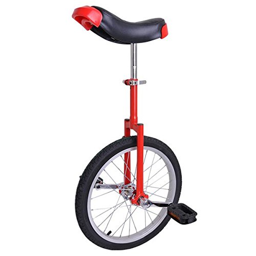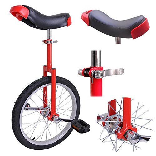 Binding : Misc. Product Description Product Features: 16" wheel (16" x 1.75" Tire) Color: Red Frame: Excellent Manganese Steel, Standard Frame of Unicycle Crank arms: WHEEL TOP Crank, International Quality Pedal: YONG HUA Pedals with Chromoly Spindles, Outer Tire: Excellent Skid Proof Mountain Tire Inner Tire: Leakage Protection Butyl tire Bearing: Heavy Manganese Steel Mute Bearing Saddle: Large Saddle with Removable Poly-nylon Guarded Rails Seat post clamp: Quick Release, Alloy Aluminum Rim: Extra Thick Alloy Aluminum Rim Fork: Steel Fork with Powder Coated Finish Great for both Novices and Professionals, Men and Women Rational designed according to somatology and movement features Remember when you're seated on the unicycle, with one foot on a pedal in its lowest position, your leg should be almost straight.