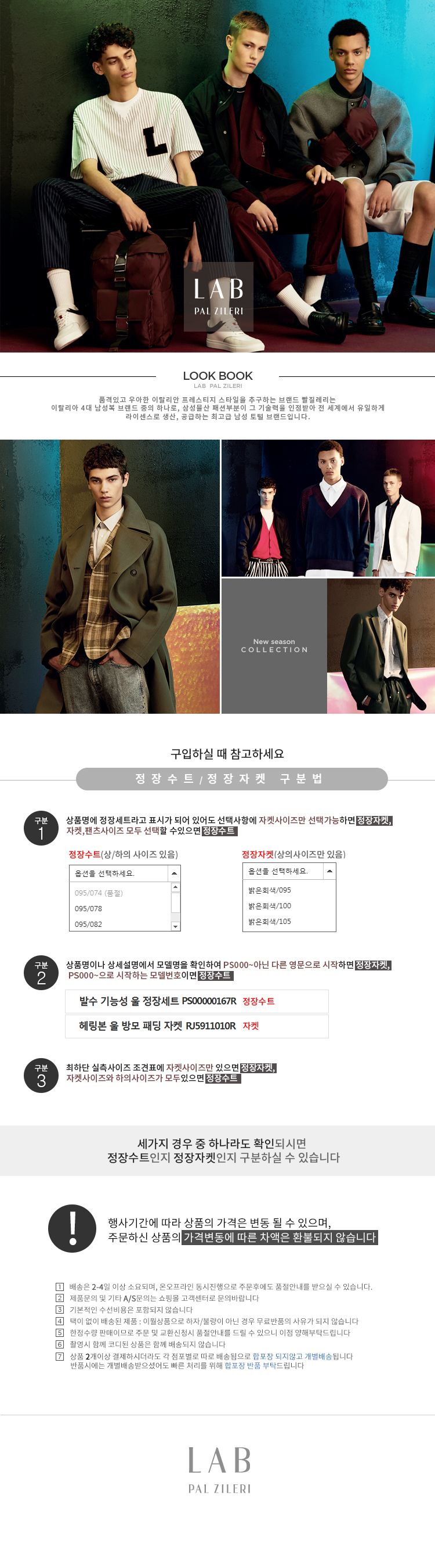 - 1. 이 제품은 반드시 세탁전문점에서 드라이클리닝하십시오. 2. 연한 색상의 제품은 반드시 깨끗한 용제로 드라이클리닝하십시오. 3. 드라이클리닝 시 단추와 액세서리는 반드시 은박지를 씌우십시오. 4. 물에 젖거나 땀이 많이 묻으면 이염, 변색, 탈색될 수 있으니 신속히 세탁하십시오. 5. 형태를 가지런히 하여 그늘에 뉘어서 건조하십시오. 6. 마찰에 의해 올 뜯김, 보푸라기가 발생할 수 있으므로 주의하십시오. 7. 화기에 가까이하면 불이 옮겨붙을 수 있으므로 주의하십시오.