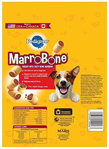 -. Binding : Misc. -. Brand : Pedigree -. EAN : 0023100100463 -. Feature : Contains (8) 24-ounce packs of PEDIGREE MARROBONE Real Beef Flavor Snacks for Dogs / PEDIGREE Dog Snacks promote healthy teeth and strong bones / Our marrow bone dog treats are enriched with vitamins A, D and E / Our real beef flavor dog chews are also made with real bone marrow wrapped in a crunchy biscuit for small to large breed dogs / PEDIGREE MARROBONE Dog Treats are made in the USA and Canada -. Label : Pedigree -. Manufacturer : Pedigree -. Model : 10102472 -. MPN : 10102472 -. NumberOfItems : 8 -. PackageQuantity : 8 -. PartNumber : 10102472 -. ProductGroup : Pet Products -. ProductTypeName : PET_SUPPLIES -. Publisher : Pedigree -. Size : 24 oz. (Pack of 8) -. Studio : Pedigree -. Title : PEDIGREE MARROBONE Real Beef Flavor Snacks for Dogs 24 oz. (Pack of 8) -. UPC : 058496709600
