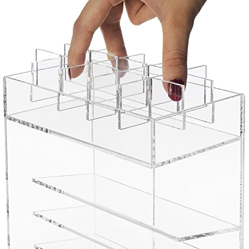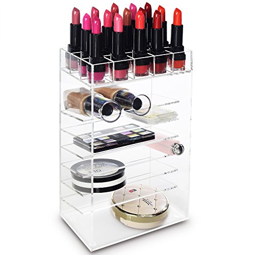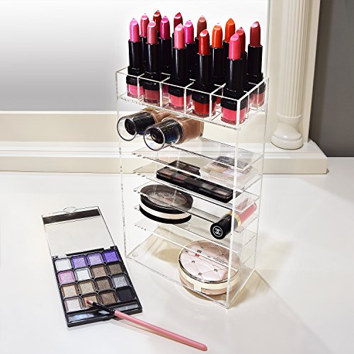 ▶ FEATURE: Contains a top compartment with a removable divider for storing up to 15 lipsticks and 7 shelves for your palettes, powders, blushes and other flat items