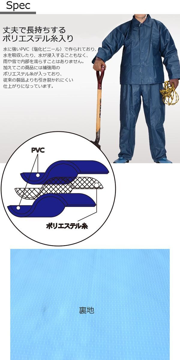 | 糸入り両面PVCラミネートで、丈夫なレインスーツ。 |