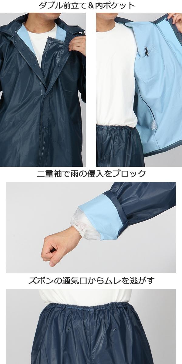 防水加工により防水性が高く、PVCとPVCの間に糸が縫い込まれているため、メーカー従来の商品よりも引き裂かれにくいのが特徴です。ドット釦により取り外し可能なフードは、クリアメガネで視界良好です。作りがしっかりしているので、全体的に重みがあります。 |