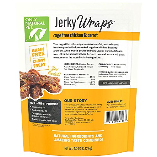 -. Binding : Misc. -. Brand : Only Natural Pet -. Feature : CAGE FREE POULTRY that's hormone- & antibiotic-free and slow cooked for a delicious, chewy texture your dog can't resist. / MADE IN THE USA from USA sourced, whole muscle poultry that's safe for your dog and high in protein and taste! / GRAIN FREE & ALL NATURAL TREATS have limited ingredients with whole muscle meat as the first ingredient and wholesome vegetables as the second. / DRY ROASTED VEGETABLES wrap around the outside of high quallity meat, giving your dog a nutritious snack. / SATISFACTION GUARANTEE - Only Natural Pet products always include a 100% Satisfaction Guarantee. Only Natural Pet uses only the highest quality ingredients in our recipes. Providing you & your pet the highest quality products is our top P.R.Iority. -. Label : Only Natural Pet -. Manufacturer : Only Natural Pet -. MPN : 999797 -. NumberOfItems : 1 -. PackageQuantity : 1 -. PartNumber : 999797 -. ProductGroup : Pet Products -. ProductTypeName : PET_SUPPLIES -. Publisher : Only Natural Pet -. Studio : Only Natural Pet -. Title : Only Natural Pet Jerky Wraps Dog Treats