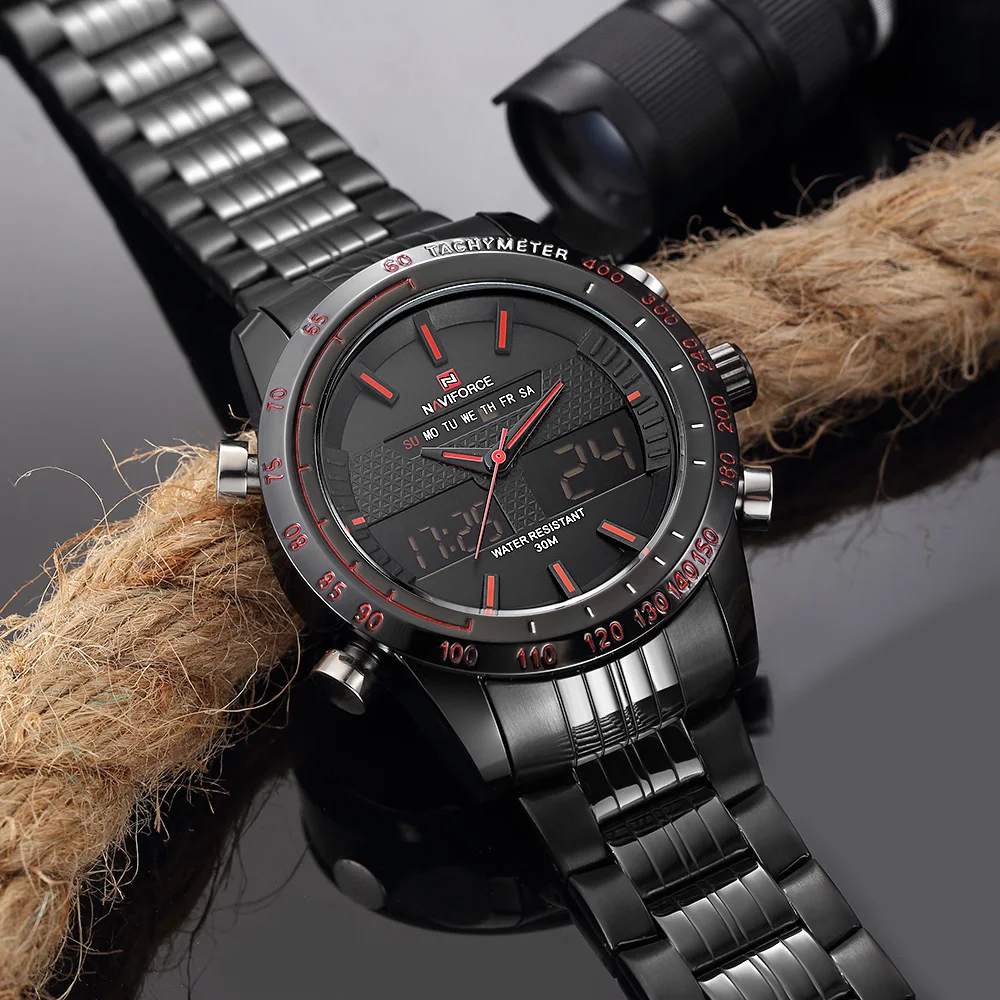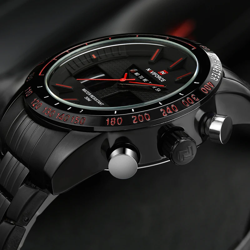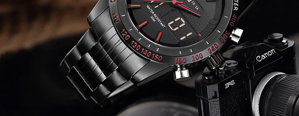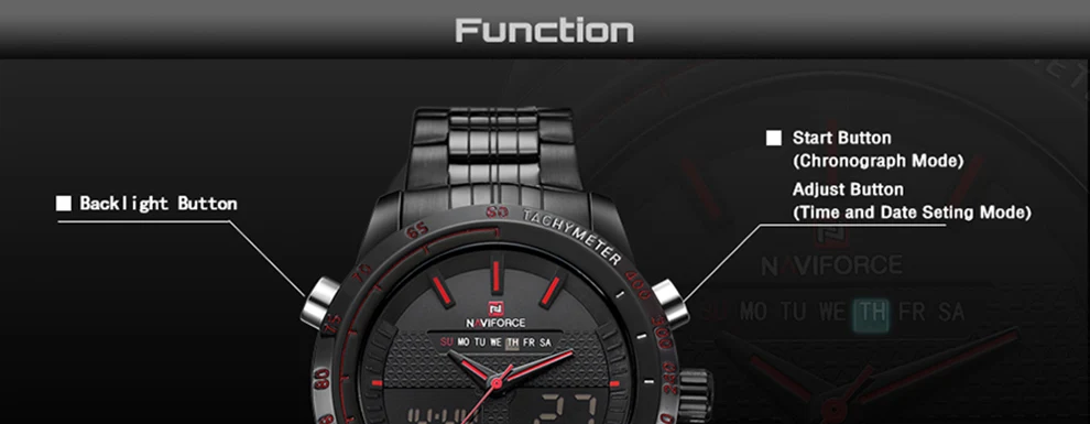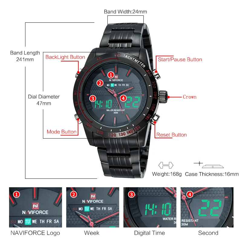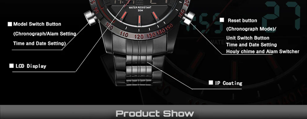 Feature:Complete Calendar,Shock Resistant,LED display,Week Display,Water Resistant,Back Light,Chronograph,Multiple Time Zone,Alarm
