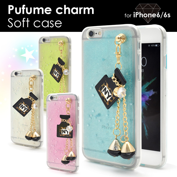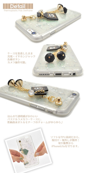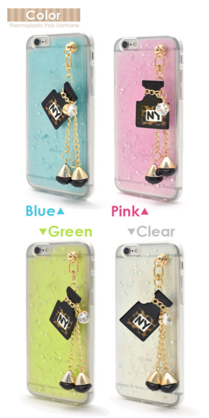 パステルカラーのラメケースに、レオパード柄香水瓶モチーフのチャームがついた