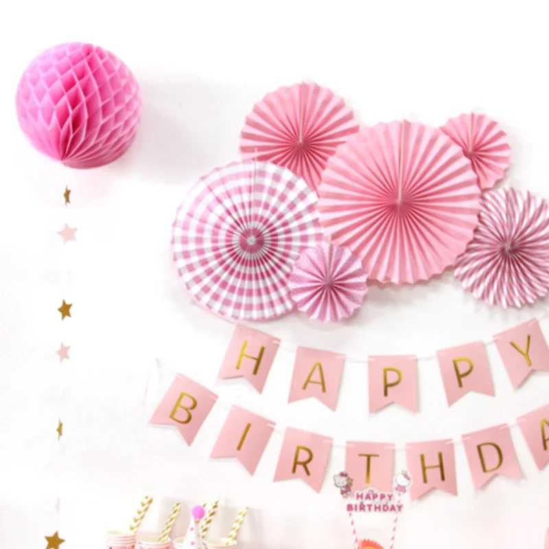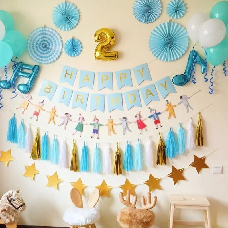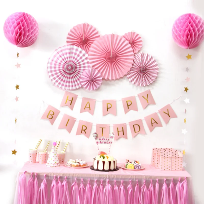 Happy Birthday Banner Tissue Paper Tassels White Pompoms Flower Balls Baby Shower Party Background Decor Party Supplies