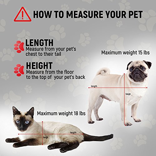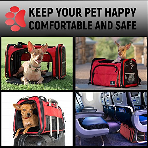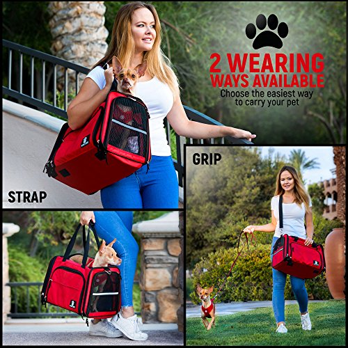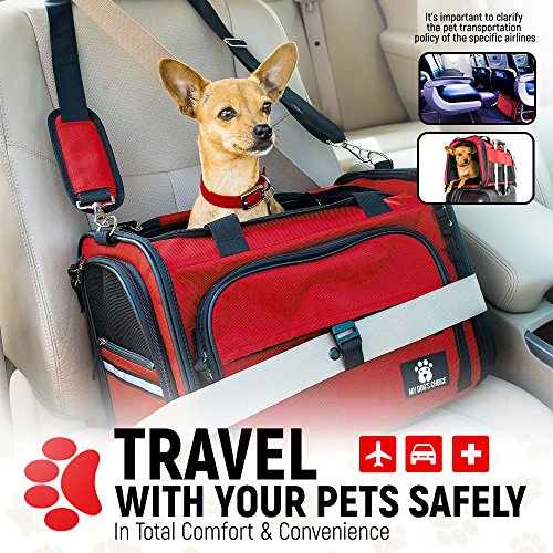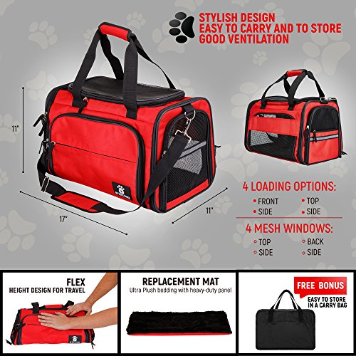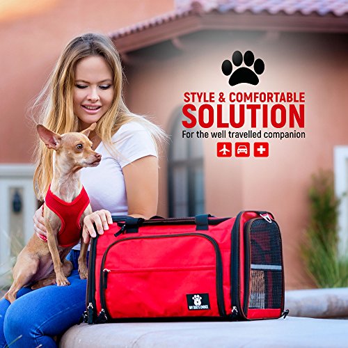 ? With its trendy and fashionable red color, the cat and dog carrier makes a great present. Use it in the car as a pet car seat, or as a deluxe pet carrier when visiting the vet DIMENSIONS: 17" L x 11" W x 11" H The Premium Airline-Approved Travel Pet Carrier is recommended for dogs up to 15lbs and cats up to 18lbs Color: ?red - the trendiest color of 2017! ?Wear it as a fashionable tote! Please note that: - 100% money back guarantee if the bag doesn't fit your pet