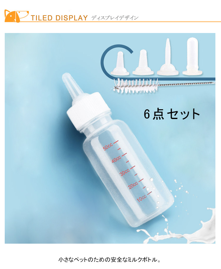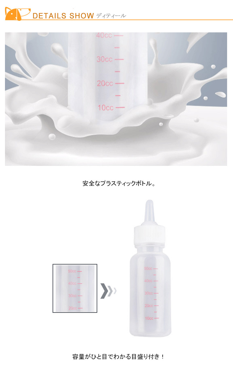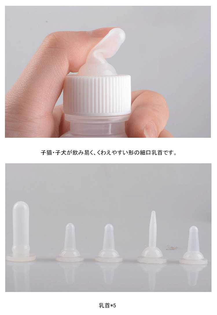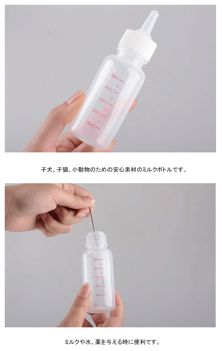 | 小さなペットのための安全なミルクボトル。子犬、子猫、小動物のための安心素材のミルクボトルです。ミルクや水、薬を与える時に便利です。 | |