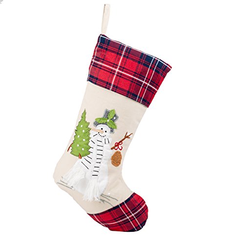 19 inch Holly Leaves on Snowman Top Hat Embroidered Christmas Stocking with Red Plaid Cuff