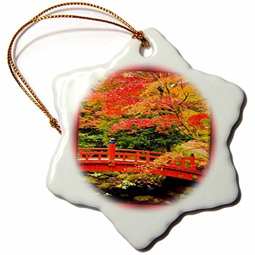 3dRose orn_53117_1 Japanese Bridge and Autumn Leaves-Snowflake Ornament, Porcelain, 3-Inch
