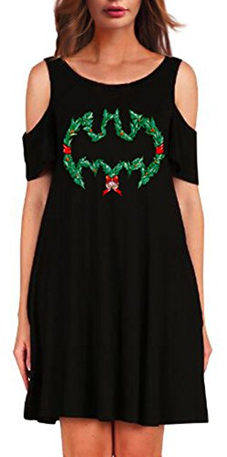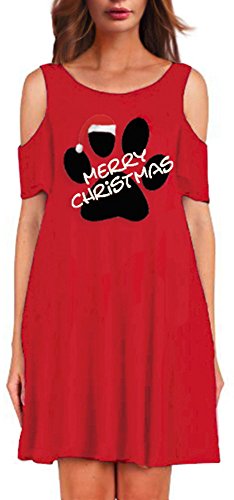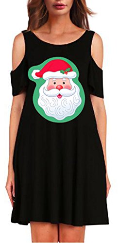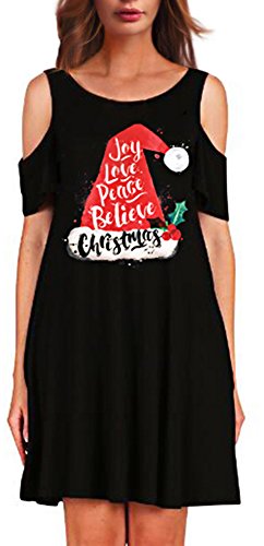 Sipaya Women Christmas Hat Print Cold Shoulder Short Sleeve Loose Dress Free Size