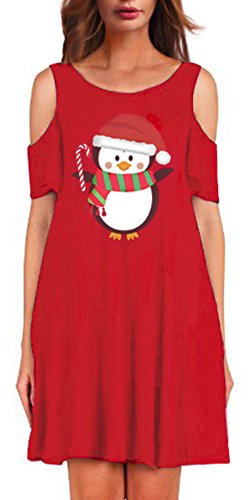 Sipaya Women Christmas Penguin Pattern Cold Shoulder Knee Length Dress for Xmas Party