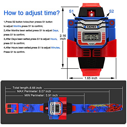 Features: 1. Digital display. 2. Comfortable watchband with fashion color. 3. Robot can be removed. 4. Best gift for Boy's/Girls/Kids/Students. Specification(Approx): Case Diameter: 4.2 cm Case Thickness: 1.6 cm Band Length: 22.2 cm Band Width: 1.5 cm Maximum wrist circumference: 20.5 cm Minimum wrist circumference: 15.0 cm Package included: 1 x Wristwatch,1 x Watch Box How to adjust time? 1,At "Normal time mode" as the sixth picture shows, a->press S2 2 times,Months appears ; b->press S1 to adjust Months;c->press S1 to confirm,Months setting done.2,After Months been setted,Days appears, a->press S1 to adjust Days, b->press S2 to confirm,Days setting done. 3,After Days been setted,Hours appears, a->press S1 to adjust Hours;b->press S2 to confirm,Hours setting done.4,After Hours been setted,Minutes appears, a->press S1 to adjust Minutes; b->press S2 to confirm,Minutes setting done. After time been setted,press S1 1 time to let time run.Feature