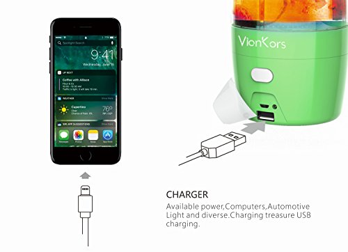Studio : Viankors Publisher : Viankors Product Description Color:Green Kisstaker passed the professional the quality inspection and security certification. All products have been well tested before shipped out. Specifications: Capacity:430ml Battery capacity: high-rate 3800MAH LI-POLYMER BATTERY Usage count: about 30 times Charging time: around 3 hours Weight: 450g Product Dimention: 78*250mm Color: Pink,Blue,Green,Purple Materials: Food-Grade PP/ Imported USA Food-Grade TRITAM Warning: ?1.Prohibited no water idling, affecting the juicer service life. ?2.After finish juicer, please clean up the cup in time. ?3.Our juicer is waterproof, but the base is full of electronic ,so prohibited soaking in the water. Package Includes : a Portable Juicer Cup a USB cable an English Manual ?If you have any questions or concerns before or after your purchase, please contact us. We will do our best to help you out. We are committed to your 100% satisfaction. 0