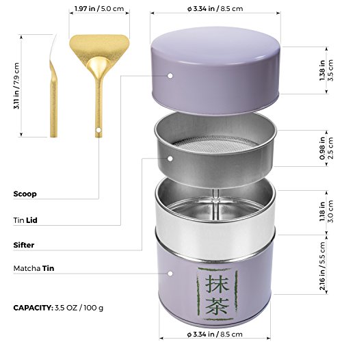 - Built-in sifter, and scoop included - Diameter 82mm X Height 95mm - Capacity up to 113g (4-ounce) of pure matcha - Fine 8mm mesh screen net