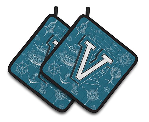 Caroline's Treasures Letter V Sea Doodles Initial Alphabet Pair of Pot Holders CJ2014-VPTHD, 7.5HX7.5W, Multicolor