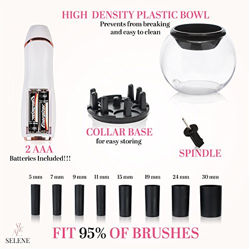 - PROFESSIONAL CLEANING AND DRYING MAKEUP BRUSHES KIT: The kit includes variety of high quality tools required for instant wash and dry: Selene Makeup Brush Cleaner and Dryer tool, automatic spinner, 8 collars to fit 95% of all cosmetic brushes, a bowl, holder, easy use set of instructions and 2 AAA electric batteries.