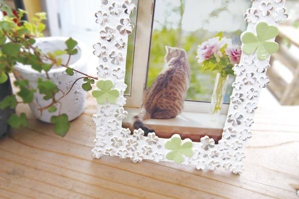 | ラッキーモチーフとして人気のクローバーがにぎやかに散りばめられたフォトフレーム。モチーフの可愛らしさだけではなく、所々に光るラインストーンのきらめきが上品さをプラスします。どこかに1つだけ隠れている四ツ葉が楽しいアクセントに。 |