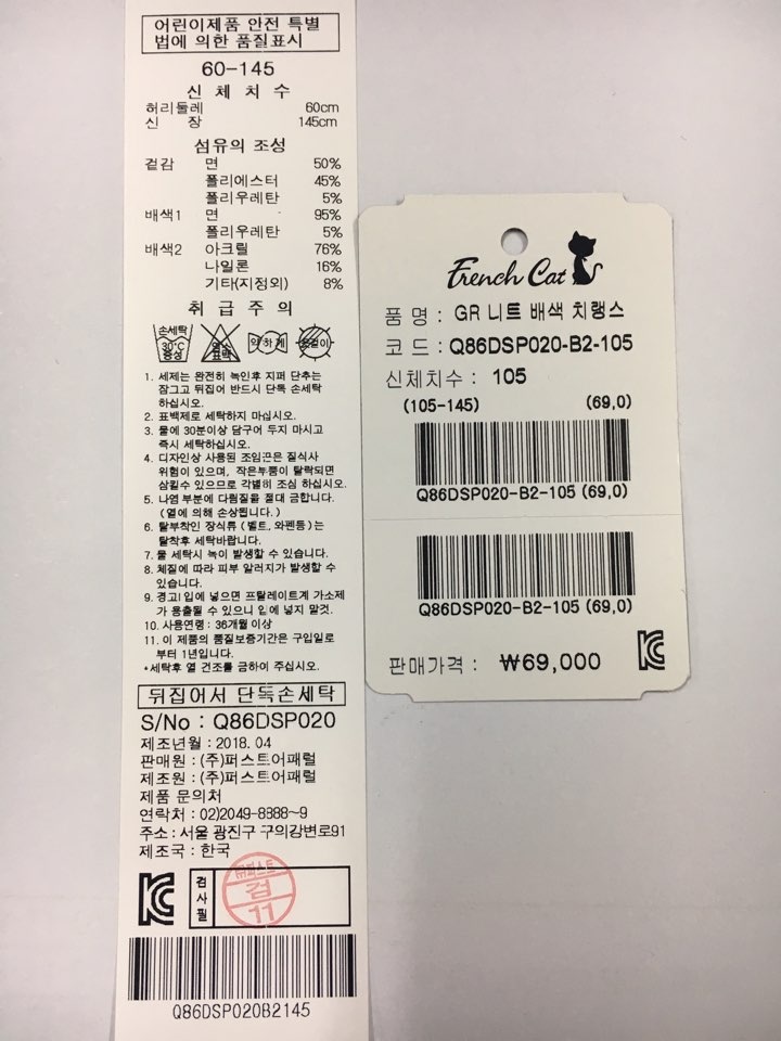제품소재 : 겉감: 면50% 폴리에스터45% 폴리우레탄5%배색1: 면95% 폴리우레탄5%배색2: 아크릴76% 나일론16% 기타(지정외)8%