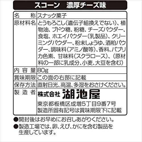 原材料:とうもろこし(遺伝子組換えでない)、植物油、ブドウ糖、粉糖、チーズパウダー、食塩、ホエイパウダー(乳製品)、クリーミングパウダー、粉末しょうゆ、酒粕パウダー、調味料(アミノ酸等)、香料、パプリカ色素、甘味料(スクラロース)、(原材料の一部に乳成分、小麦、大豆を含む)