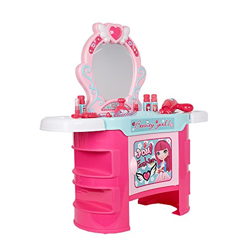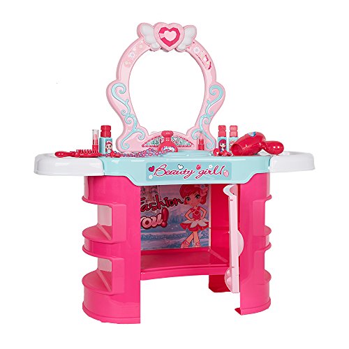 *Cute vanity table for your little princess with built-in mirror *Includes toy jewelries, cosmetics and hair accessories,total 23 pieces *Use 3 AA battery for play,battery not inculded *Make up table for little girls with sound and light *Little girls will be in heaven, with their own little make up table with accessories.Feature