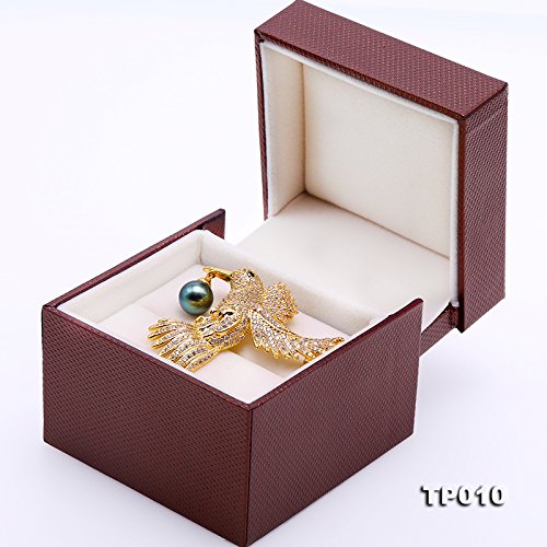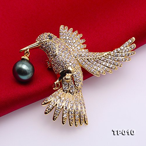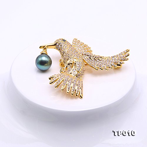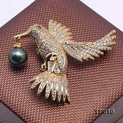 Description *Gorgeous Tahitian pearl brooch with eagle design. The eagle is inlaid with sparkling zircons, with a 10 mm peacock green Tahitian pearl. The high quality pearl has perfectly round shape, smooth skin, and strong lustre.