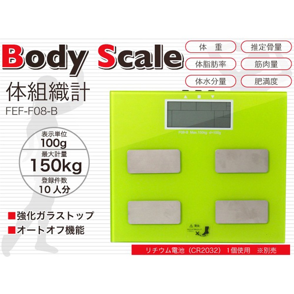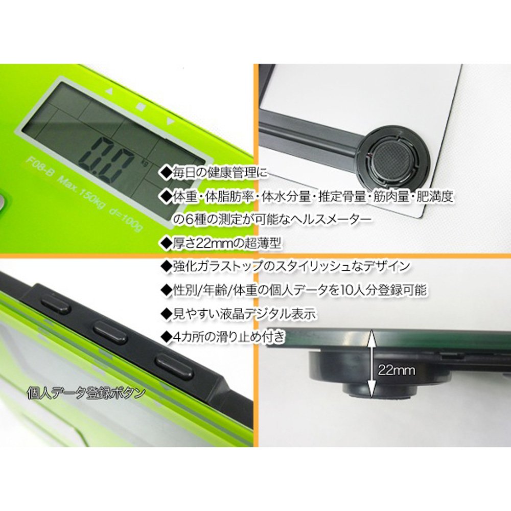 [Product Details] Measurement function: weight / body fat percentage / body water content / estimated bone mass / muscle mass / obesity degree function Auto off function measurement Indication unit: 0.1 kg unit Maximum measurement weight: 150 kg Body fat percentage measurement: 4.0 to 80.0