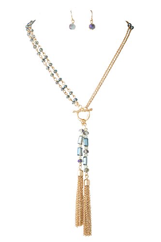 28 inch toggle closure double tassel Y-shaped blue aurora borealis glass bead lariat necklace in gold-tone.