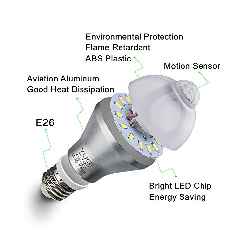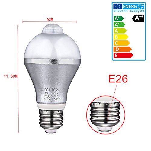 - Voltage:AC85-265V 50/60Hz, Wattage:9W, Color:White(6000-6500K),Luminous: 810lm±10%,Detection Range:9-16ft,Lamp Style:E26,Aluminum shell, good heat dissipation performance.
