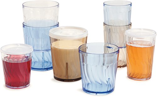Product Description The Dinex swirl SAN clear tumbler has a swirling glass-like appearance and is dishwasher safe. The cup has embossed lines that indicate 2-oz. Increments for monitoring fluid intake. The polycarbonate material is resistant to breakage. 0