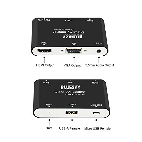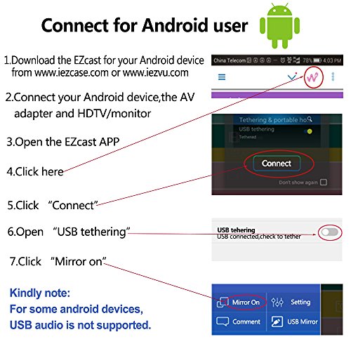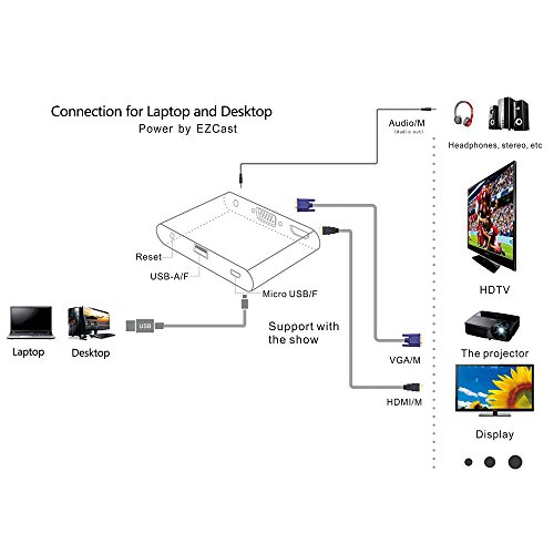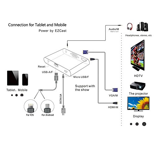 This digital AV adapter is based on EZCastAP, support multiple systems. You could convert the video from connect your mobile, tablet, laptop to a big monitor. Most importantly, it could update regularly to keep compatible with your latest operating system. Adapter Installation Connect to TV, Projector, Monitor Connect the HDMI or VGA port to the corresponding interface of TV, projector, monitor, and choose the corresponding signal channel. It will support audio and video output at the same time. Connect to computer, IOS, Android, Windows PC, MacBook: 1) Connect to Desktop/Laptop: prepare a standard USB cable, then connect the USB-A port to your desktop or laptop, and connect the micro 5pin port to our digital AV adapter. 2) Connect to IOS/Android diveces: the standard USB cable will be used as a power adapter ,for iphone or ipad suggest to use the original lightning cable to connect your device to this AV adapter