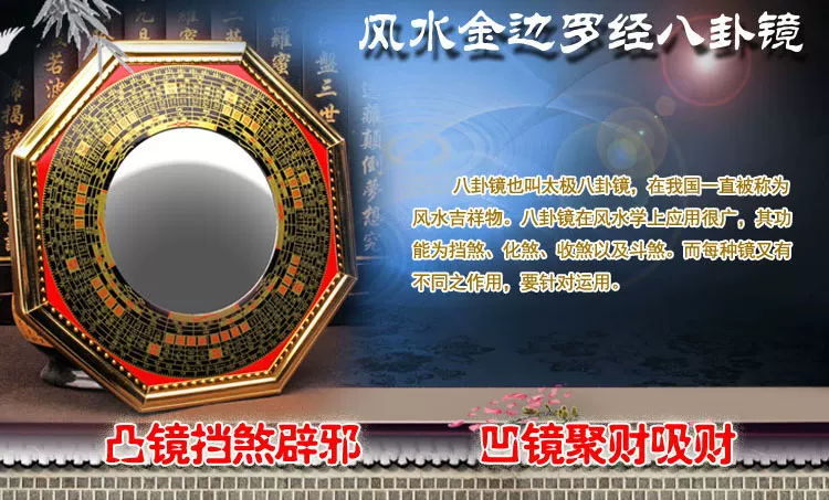 八卦镜 八卦镜也叫太极八卦镜:在我国一直被称为风水吉祥物。据传,在距今七千年前的上古时代,伏羲氏观物取象,始作八卦。"以通神明之德,以类万物之情。"《易系辞传》说:"易有太极,是生两仪,两仪生四象,四象生八卦。"太极就是一,就是道,是元气浑然之象,是造分天地的根源。太极动而生阳,静而生阴,一阴一阳就是两仪。而两仪又生一阴一阳既是四象(少阳、老阳、少阴、老阴)。四象是天地阴阳在自然界中的变化,也代表春夏秋冬四时。而四象再各生阴阳,就生成了八卦。八卦用以代表天、地、风、雷、水、火、山、泽,并表示健、顺、动、人、陷、丽、止、说等。而镜自古以来就是震慑邪魅的吉祥之物。传说"帝会王母于王屋,铸镜十二,随月用之,此镜之始也。"古镜用铜铸成,在战国时期就开始盛行。太极八卦图,以同圆内的圆心为界,画出相等的两个阴阳表示万物相互关系。阴鱼用黑色,阳鱼用白色,这是白天与黑夜的表示法。阳鱼的头部有个阴眼,阴鱼的头部有个阳眼,表示万物都在相互转化,互相渗透,阴中有阳,阳中有阴,阴阳相合,相生相克,即现代哲学中和矛盾对立统一规律表示法。 凹镜——凹面八卦镜其作用为收为吸,例如家中大门对着向下楼梯的话,是一种泄气之象,即漏财之屋。在大门上挂凹镜可收回泄出之气,挂放时就很考究风水师之技术了。凹镜还有另一用途为收煞,正所谓要快发,就要去斗煞,收煞即收财,特别是在十字路边的三煞位做生意,能把街中之财气收为己用,收煞只适宜用于商业性质之场所,否则易影响人的健康,但收煞就必需掌握一定之风水知识才可运用,否则收而不化就弄巧反拙了,其实在收煞的同时亦要采取一定之化煞措施,其重在于把煞气分散、打散、务使其煞力减弱,化掉一部分,留下一部分,再引煞入屋,通过在室内布局上的精心策划,转煞为财。 凸镜——凸面八卦镜其特性一般为化煞、挡煞之用,其作用是把煞气反射、化散、缓解。即遇到路冲、反弓、灯柱、电线杆、角煞等都可采用凸镜。这样可把凶宅变为吉宅。如宅外环境没有煞气的情况下,在自家挂了凸镜,这极可能会把家中的吉气反射出去,那么又会对家运产生影响,所以,无论挂何种八卦镜都应当谨慎,但有一点应要注意的是切莫对人家大门,这样不讨好。即使有煞气想解决都可以采取其它方法,不一定非要采用八卦镜对着人家大门。