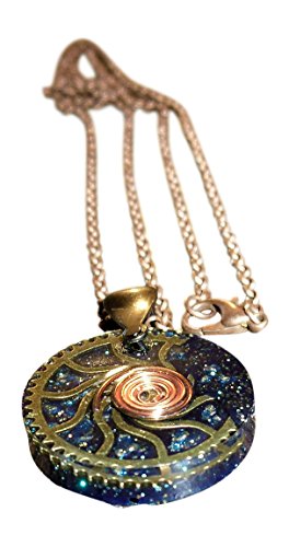 Double spirals amplify the orgone energy. This vortex rests on a backdrop of golden blue energy - pyrite chips (a mineral which contains traces of cobalt, nickel, silver, and gold) and a center point magnetite lodestone bead (a natural magnet). Elegant unique design.