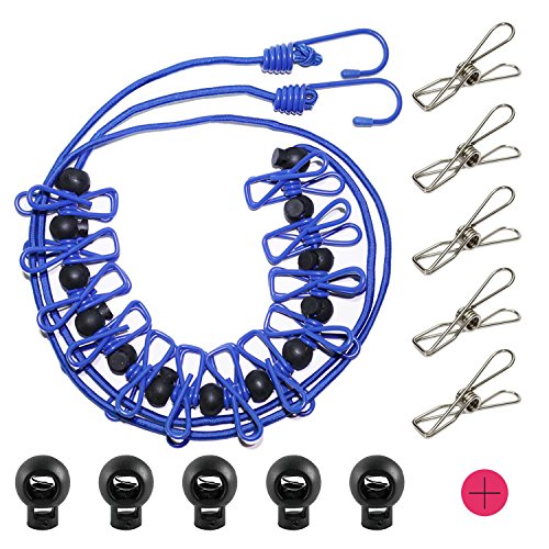 - Clothesline with 13 pcs black positioning buckle that restrain the 12 pieces of clothespins to sliding around, protect the clothes from being blown away. Those that love traveling, camping, swimming, fishing, boat riding etc. can use it between the trees or in their canopy to attach wet towels and trunks.Additional with 5pcs Stainless Steel Spring Utility Clip and 5pcs Single Hole Spring Round Ball Fastener Locks Buttons