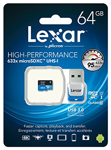 Capture your adventures in HD. Designed for your sports camcorder, tablet, or smartphone, Lexar High-Performance microSDHC/microSDXC UHS-I cards (633x) make it easy to quickly capture play back, and transfer 1080p full-HD, 3D, and 4K video, as well as the highest-quality movies, photos, and songs. These high-capacity, Class 10 cards leverage UHS-I technology to deliver high-speed performance-up to 633x (95MB/s). The cards also come with a USB 3.0 reader for high-speed file transfer. These premium memory solutions give you the speed and space you need to capture more adventure on the go.Feature