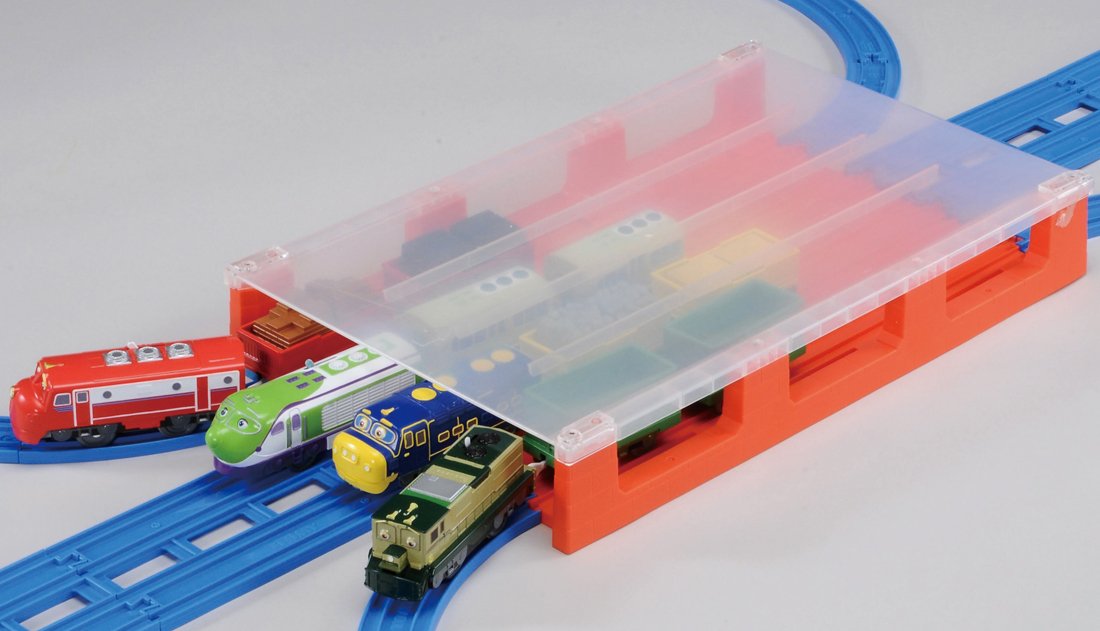By stacking it becomes a large plastic rail case and you can store many vehicles.