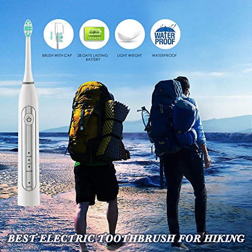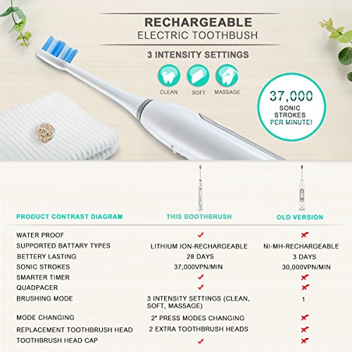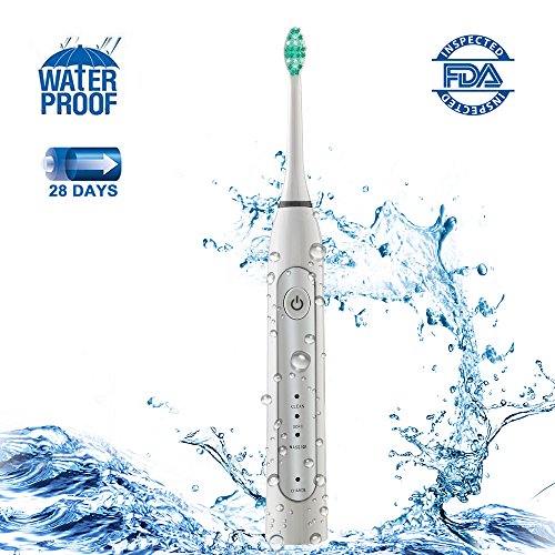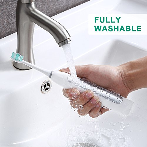 -. Feature : ★POWERFUL CLEANING: This sonic electric toothbrush delivers up to 37,000 brush strokes per minute, removes up to 10x more dental plaque along the gumline than manual brushing. The sonic electric toothbrush can improve gum health up to 100% better than a manual toothbrush. / ★LONG LASTING BATTERY LIFE: 28 DAYS and Lithium Ion-Rechargeable support, light weight electric toothbrush! / ★3 BRUSHING MODES, SMART TIMER & QUADPACER : Clean (Regular), Soft (Sensitive), Massage (Gum Care). Each mode has a 2 minute automatic brushing cycle with interval pause reminding per 30 seconds to encourage good dentist recommended brushing habit. Soft mode of this electric toothbrush is good for new users and children over 8. / ★WATERPROOF AND MORE : This electric toothbrush is fully washable! it is easy to clean the sonic electric toothbrush in water. / ★2 YEARS WARRANTY: Satisfaction guarantee, if a purchased sonic electric toothbrush doesn't operate properly within 24 months, a new electric toothbrush will be replaced for free.
