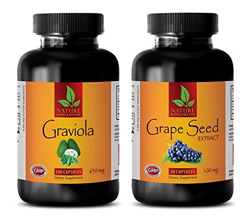 -. Feature : GRAVIOLA - GRAPESEEDEXTRACT: Grapes have been used for centuries to boost numerous conditions. The grape seeds are even beneficial, as they are the source of grape seed extract, which offers several of its own health benefits. Soursop is a tropical plant. Useful properties of the fruit and its leaves are numerous, and you won't describe them in a couple of words. It perfectly tones up and strengthens immunity, positively affects the cardiovascular system. / What is grape seed?: Grape seed is a by-product from the making of wine from grapes. Grape seed may also be known as Grape Seed Extract. Grape seed extract has been used as a possibly effective help in improving blood flow in the heart. Other uses proven have included improving night vision, high cholesterol, and other conditions. Grape seed is often sold as an herbal supplement. / Skin Health: A pulverized seed of the soursop fruit acts as a skin astringent, helping you to reduce lines and wrinkles, and improve the appearance of age spots and marks. Enjoy healthier skin, while also protecting yourself from aging issues. The soursop leaves benefits also consist in the health impact. Such property is essential not only in the presence of skin problems but also in the inside issues. Antioxidants improve protective functions of a skin and slow down aging. / Weight Loss: The active ingredients within grape seed extract to inhibit fat deposition within the body, and even lower the level of fat absorption from our diet. Combined with a negligible amount of calories, this extract can give you an energetic boost and speed up the metabolism, which can further support your weight loss efforts. Soursop compound in our herbal supplement may show its beneficial properties on weight loss. There are positive influence of soursop leaves on digestion. / OUR GUARANTEE: PREMIUM QUALITY SUPPLEMENT PROUDLY MANUFACTURED IN THE USA! We use only the very best ingredients, all of which are manufactured in state-of-the-art facilities, with strict adherence to good manufacturing practices (GMP).