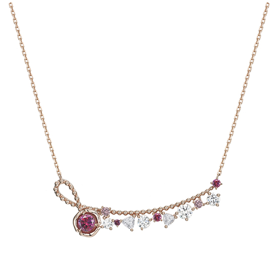 * 이슬 맺힌 가지를 메탈볼로 표현하였으며, 그 옆으로 색색의 꽃잎을 리드미컬하게 배열하여 페미닌 로맨틱 무드를 극대화 시킨 목걸이 디자인