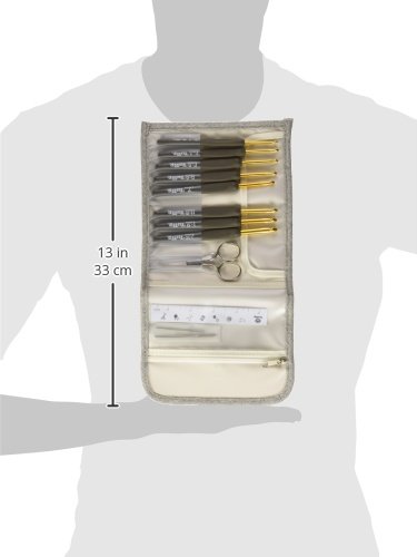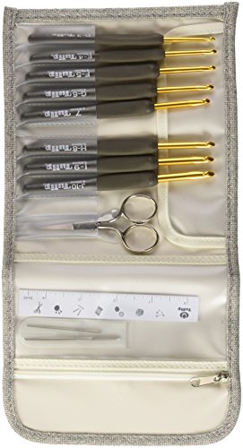 Includes 8 crochet hooks, 2 yarn needles, high quality thread, scissors, 4-1/2 inch plastic ruler and an attractive clutch to keep what is sure to be your most cherished tools safe and organized