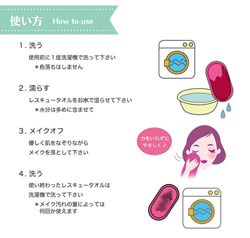 【使い方】【1】洗う(使用前に1度洗濯機で洗ってください)【2】水で多めにタオルを濡らす★★お風呂につかりながらもOK★★【3】優しく肌をなぞりながらメイクオフ【4】使い終わったタオルは洗濯機で洗っておしまい