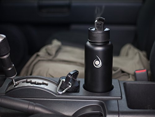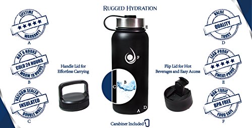 Stainless Steel Water Bottle 32oz by Rugged Hydration - Vacuum Insulated, BPA & Toxin FREE, Leak Proof, Sweat Proof, Hot & Cold Up to 24 Hours, Includes 3 Lids & Carabiner, Good for Kids, Eco Friendly