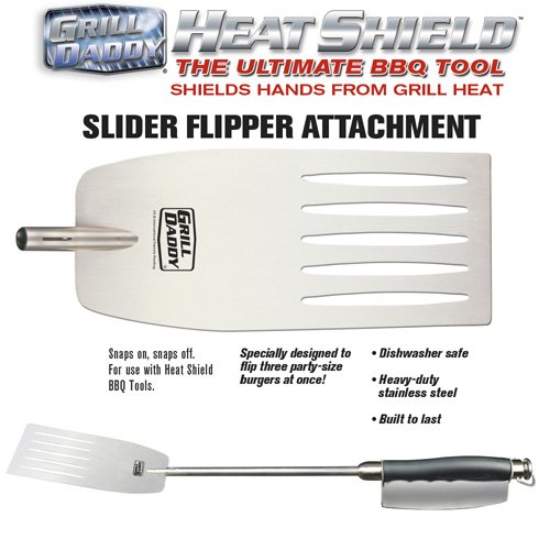 Studio : Grill Daddy Brush Company Publisher : Grill Daddy Brush Company Binding : Lawn Patio Product Description Grill Daddy heat shield barbecue tools shield your hands from grill heat and splatter. Durable stainless steel fish flipper attachment is perfect for grilling fish to vegetables. Detachable fish flipper mixes and matches with other attachments on the ergonomically designed heat shield handles. Heat shields swivel with your hand for continuous protection while attachment is on the tool. Even while handling food on the grill, the heat shield freely rotates to keep protecting your hand from the grill's heat. Always handy heat shield tools magnetically hang from grill shelf or caddy. 0