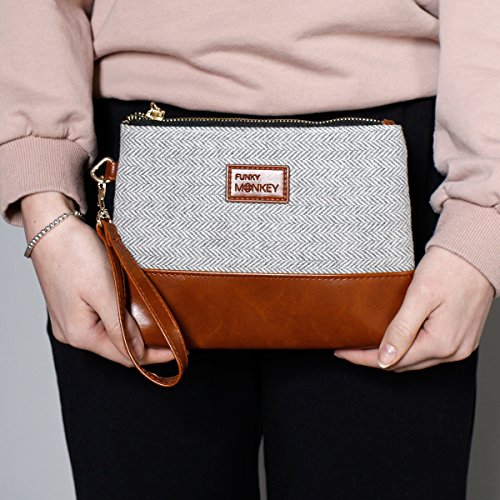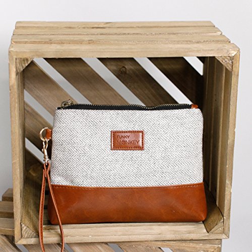 Studio : Funky Monkey Fashion Publisher : Funky Monkey Fashion Product Description Greta Wristlet Collection: ? Horizontal Brown and Cream Herringbone Brown Vegan Leather Bottom This zippered clutch is a beautifully coordinated faux leather bottom with a coordinating tweed fabric top. Each is fully lined with a black fabric. Each also has a removable wrist strap with antique brass hardware, allowing you to secure around your wrist or tuck in a larger tote. The small size is a great way to carry all your cards, cash, and lipsticks for those on the go moments in life! The medium and Large size works great as a "hold all" wristlet from your phone to cards and must have everyday items! 0