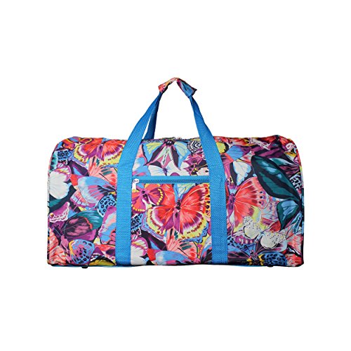 -. Binding : Apparel -. Brand : World Traveler -. Feature : 600D heavy duty polyester, lightweight body construction / Adjustable ergonomic shoulder strap / Front zipper pocket / Dimensions: 22" l x 10" w x 11" h - 1.3 Lb / 22x10x11 -. Label : World Traveler -. Manufacturer : World Traveler -. PackageQuantity : 1 -. ProductGroup : Apparel -. ProductTypeName : BAG -. Publisher : World Traveler -. Studio : World Traveler -. Title : World Traveler Value Series 22-Inch, Blue Butterfly Duffel Bag