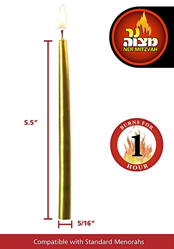 GOLD METALLICS: Add shine, splendor & a luxurious touch to your menorah with these golden metallic candles. Kindled flames reflect beautifully off their shiny surface.