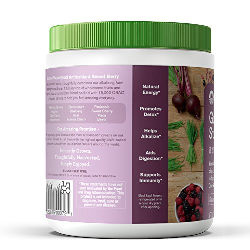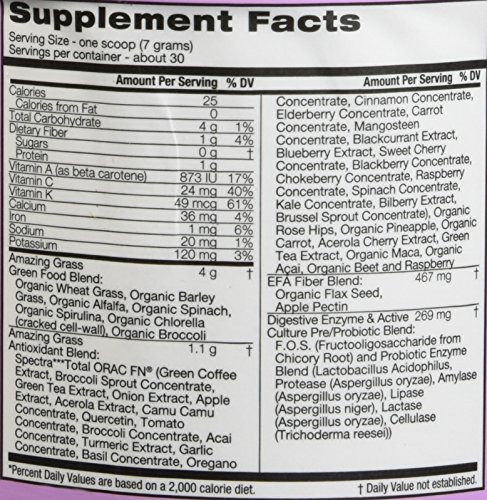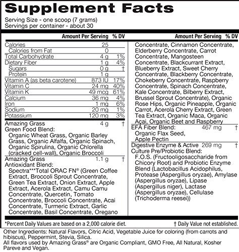 Studio : Amazing Grass Publisher : Amazing Grass Binding : Grocery Product Description This powerful blend thoughtfully combines our alkalizing farm fresh greens and wholesome fruits and veggies plus an anitoxidant blend packed with 15,000 ORAC units per serving to help you feel amazing every day. At Amazing Grass our roots run deep...Back to our family farm in Kansas, where for over 3 generations Amazing Grass has organically grown harvested the most nutrient-dense greens on earth. Today, we thoughtfully craft our greens with the highest quality, plant-based ingredients curated from like-minded farmers from around the world. Amazing Grass products are a delicious way to nourish your body with the whole food nutrition it needs to feel amazing every day. 0